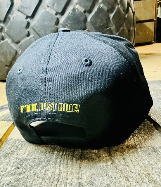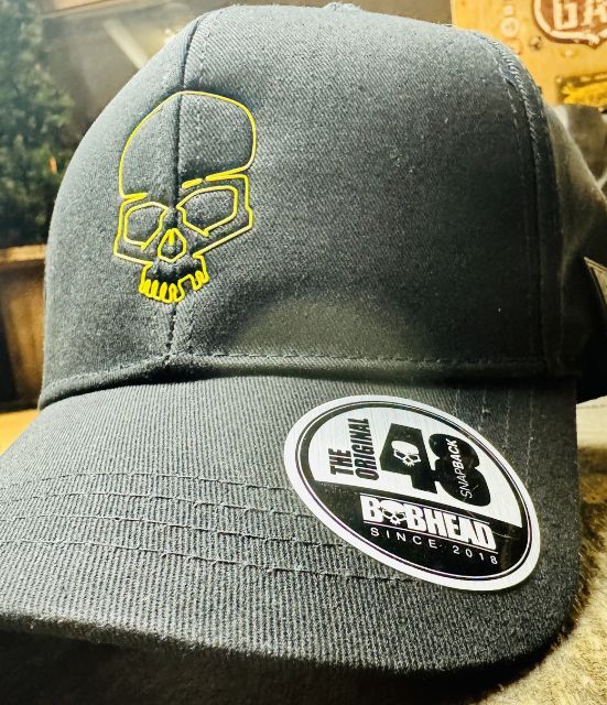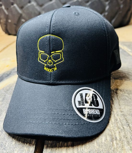 DESCRIZIONE: BOBHEAD Baseball Rascal Snapback - Nero su nero con teschio BOBHEAD delineato in giallo sul davanti, logo completamente in gomma a taglia unica e F**K it Just ride! sul retro del cappuccio.