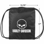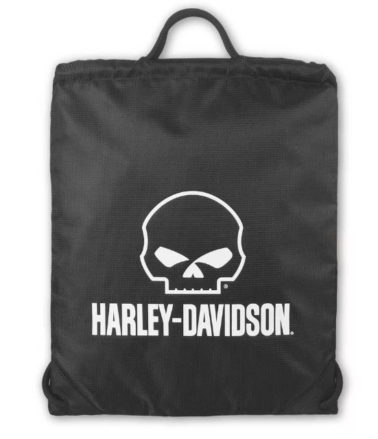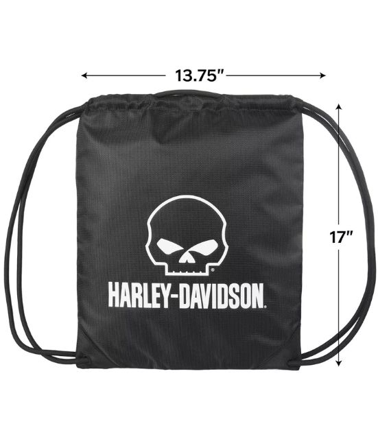 DESCRIZIONE: Zaino Harley-Davidson® Willie G Skull in poliestere ad estrazione rapida - Nero. Realizzato in robusto poliestere ad alta densità. Corde doppie. Si trasforma in zaino o porta tutta la borsa. Ampia apertura per la tua attrezzatura in movimento. Dimensioni: 17" x 13,75".