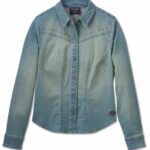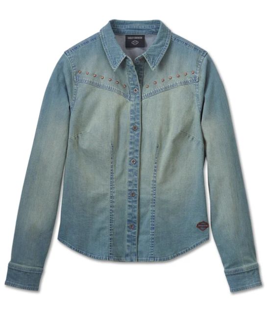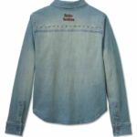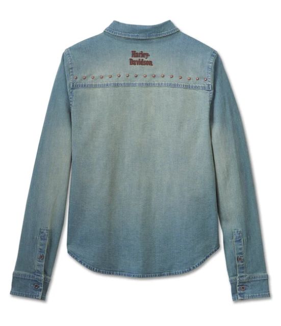 DESCRIZIONE: Per un look versatile di ispirazione Western, aggiungi questo capo in edizione limitata al tuo guardaroba. La camicia jeans H-D® è fabbricata in denim di cotone con un tocco di spandex per una maggiore elasticità, sottoposto a trattamento sbiadente per conferire un aspetto vissuto. Il carré in stile Western, le borchie decorative, le pinces sul busto e le cuciture a corpetto esaltano lo stile e valorizzano la figura. Questo camicia button-down da donna è provvista di un colletto a pressione che rimane saldamente ancorato anche alle alte velocità. Il branding è essenziale, per uno stile Harley-Davidson sobrio ed elegante.