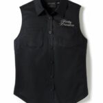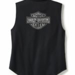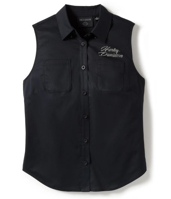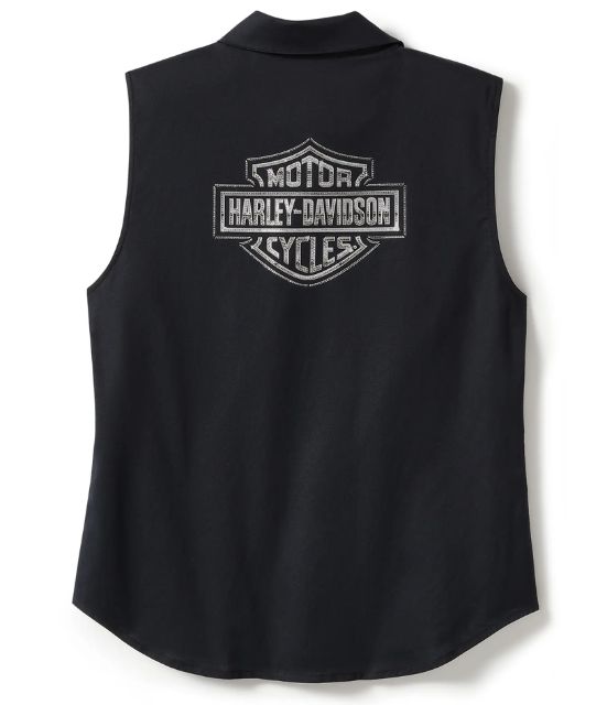 DESCRIZIONE: Camicia senza maniche Harley-Davidson Essential, iconica scritta sul lato sinistro e Bar & Shield sulla parte superiore della schiena tutto luccicante di strasse! Realizzata in morbido mix di cotone 60% e Tencel 23% con un 17% di twill di lino di peso medio. Il taglio e le pinces modellano il busto e mettono in evidenza la tua silhouette.
