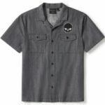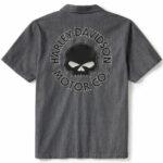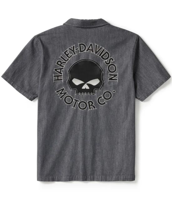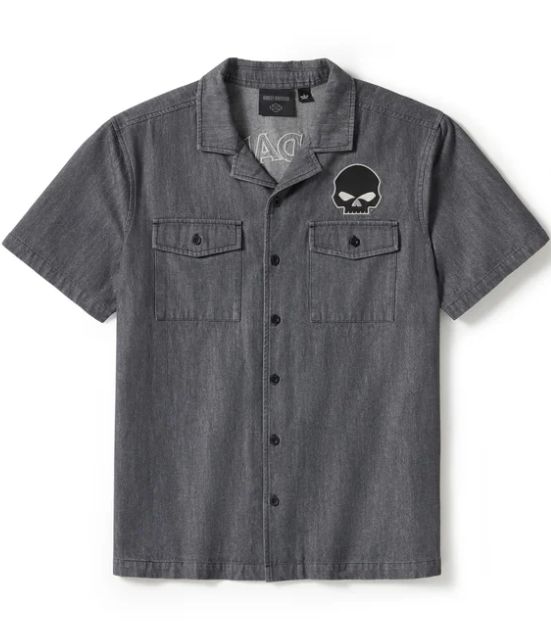 DESCRIZIONE: Comfort e creatività artistica si fondono perfettamente nella camicia jeans Willie G™ Skull. È realizzata in twill di cotone fiammato pesante lavato a pietra per un look testurizzato e consumato (ingrandisci per vedere). Questa camicia da uomo a maniche corte con bottoni presenta una vestibilità più abbondante, ed è rifinita con una grafica vivace del celebre teschio di Willie G. Una pillola di storia: benché proprio il teschio sia una delle creazioni più famose di Willie G. Davidson, questo genio poliedrico firmò anche diverse motociclette, tra cui la FX Super Glide® del 1971 e la Low Rider® del 1977.