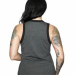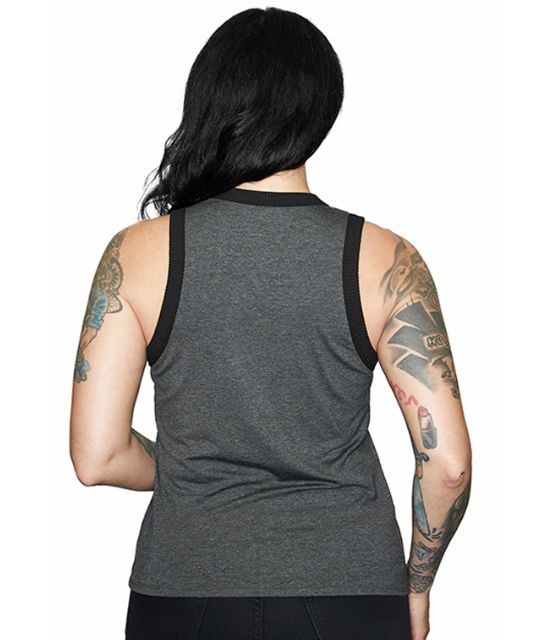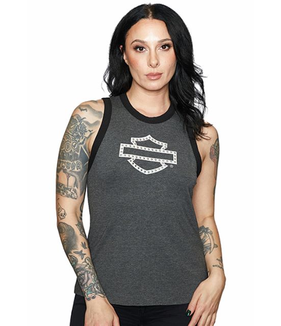 DESCRIZIONE: Canotta donna grigio melange con collo e giro maniche in contrasto nero a costine. Logo Bar & Shield bianco con borchie tonde. Vestibilità regolare.