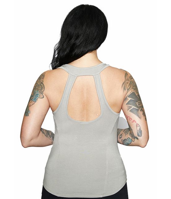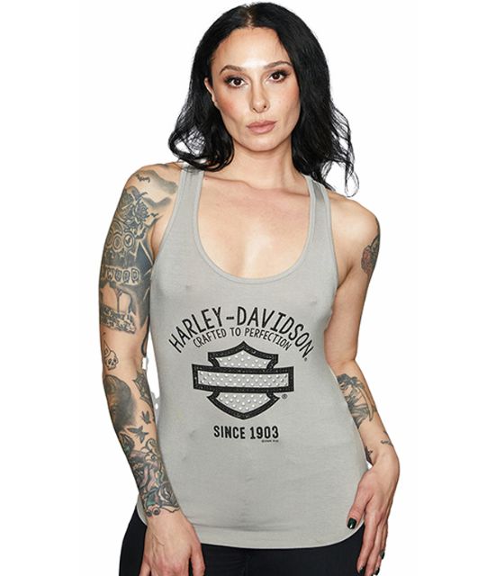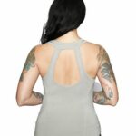 DESCRIZIONE: Canotta donna grigio chiaro con scritta e Bar & Shield color nero e piccole borchie nere stile rock n roll. La scollatura dietro molto stile americano.