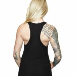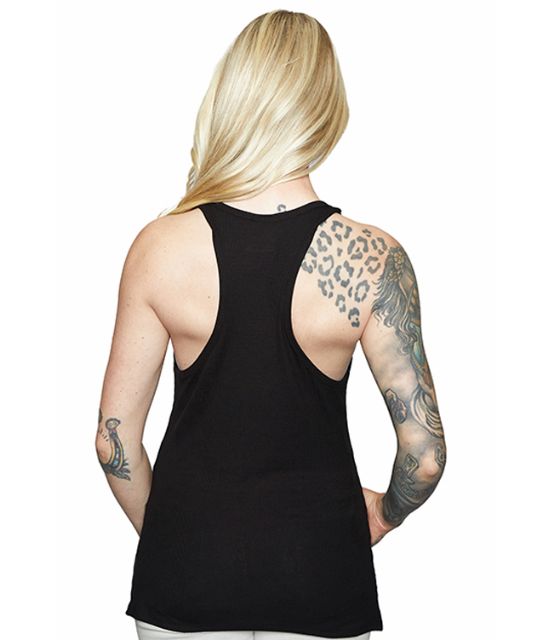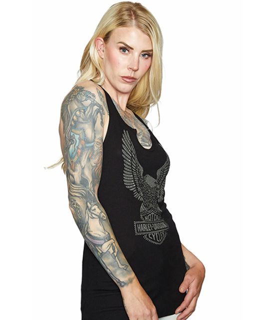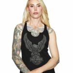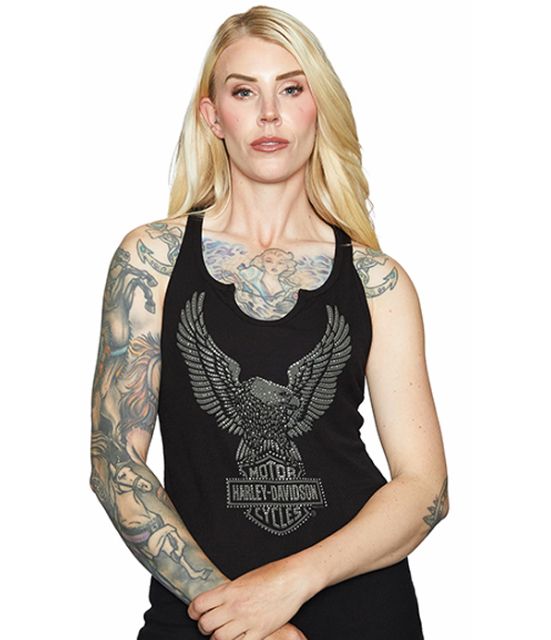 DESCRIZIONE: Canotta donna a costine scollo V ma arrotondato e spalle dietro all'americana. Disegnata l'icona Harley-Davidson "Aquila e B&S" il tutto impreziositi da strasse argentati. Vestibilità regolare.