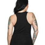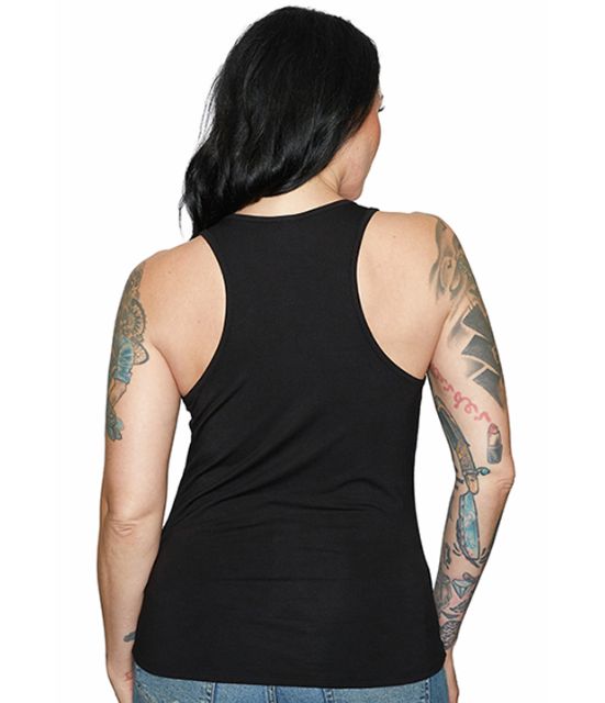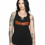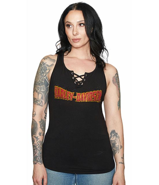 DESCRIZIONE: Canotta nera Donna con scollatura con borchie e lacci intrecciati che la chiudono. Scritta fiammeggiante Harley-Davidson tonalità rosso e ora con strasse che riprendono gli stessi colori. Vestibilità regolare.