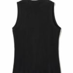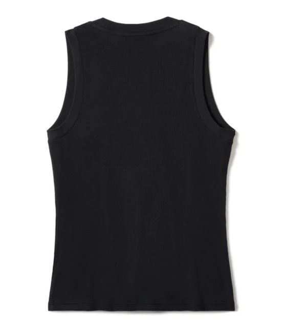 CARATTERISTICHE: Costina 2x2 leggera 58% cotone, 38% modal, 4% spandex. Taglio attillato. Bordo risvoltato su collo e giromanica. Scollo ampio e profondo. Orlo diritto. Applicazione ricamata con stampa a mano morbida.