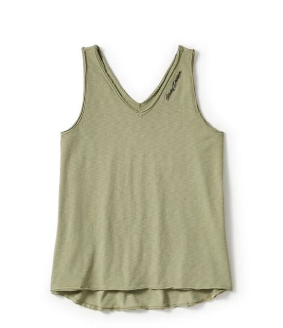 CARATTERISTICHE: Jersey fiammato negativo di peso medio, 100% cotone, lavato a pigmenti. Silhouette rilassata. Profondo scollo a V davanti e dietro. Orlo alto-basso esagerato. Dettaglio bordo grezzo su scollo, giromanica e orlo inferiore. Ricamo diretto.