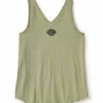 DESCRIZIONE: Rilassati in stile moto senza maniche con la nostra canotta Essential V Drapey. La sua vestibilità rilassata è realizzata in jersey fiammato interamente di cotone per un look testurizzato e una sensazione ariosa. Presenta uno scollo a V profondo e lusinghiero sul davanti e sul retro, un orlo alto-basso esagerato e un bordo grezzo. Questa canotta da donna è rifinita con una serie di grafiche ricamate per un look Harley-Davison sobrio e senza tempo.