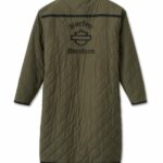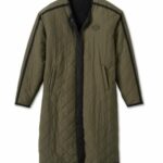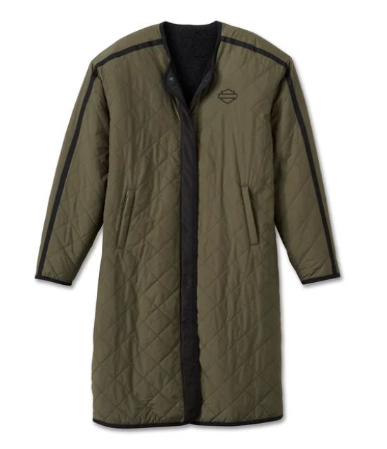 CARATTERISTICHE: Tela leggera 100% poliestere (lato A). Sherpa 100% poliestere (lato B). Imbottitura in poliestere leggero. Abbottonatura a pressione reversibile. Tasche scaldamani a filetto oblique con chiusura nascosta a cerniera e a pressione. Reversibile. Lunghezza fino alle ginocchia. Bordo a contrasto su abbottonatura, colletto, polsini e orlo. Cuciture nastrate applicate su maniche e carré posteriore. Ricamo diretto.