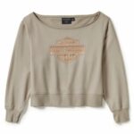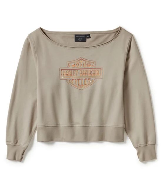 DESCRIZIONE: DESCRIZIONE: La felpa Chrome Evo rivisita in chiave motociclistica uno stile tipico degli anni '80. Realizzata in tessuto French terry in puro cotone sottoposto a lavaggio ammorbidente, garantisce ore di comfort sulla pelle. Questa felpa da donna dalla vestibilità rilassata e accorciata presenta una lusinghiera scollatura off-the-shoulder con bordi a taglio vivo, spalle scese e fori per i pollici dei polsini. Le vivaci immagini in stile cromato che adornano il davanti rendono omaggio all'epoca del motore Evolution®, o "Evo", che va dal 1984 fino al 1999.