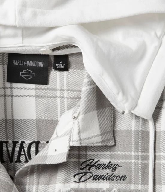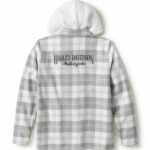 CARATTERISTICHE: Twill scozzese pesante tinto in filo 100% cotone (giacca camicia), 60% cotone, 40% pile di poliestere (cappuccio removibile). Chiusura frontale a bottoni. Tasche sul petto con patta e bottone. Tasche scaldamani con patta e bottone. Cappuccio removibile (cerniera), foderato in jersey con coulisse. Colletto con bottoni a pressione nascosti Spacchi laterali. Ricamo diretto.