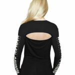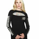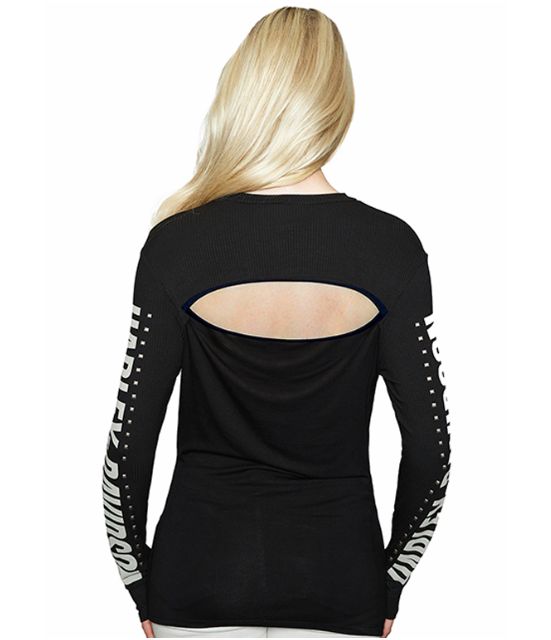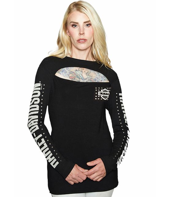 DESCRIZIONE: Maglia donna maniche lunghe  nera con tessuto rayon e spandex, maniche a costine con scritta in verticale Harley-Davidson e con borchie piccole che contornano la scritta in bianco. Frontale troviamo un Bar & Shield contornato da borchie e strasse, apertura davanti e dietro che appare come indossare uno scalda spalle.