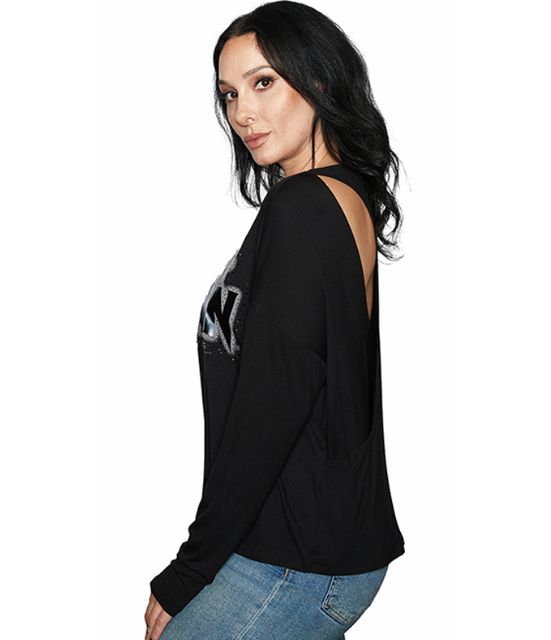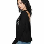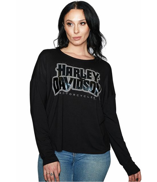 DESCRIZIONE: Maglia maniche lunghe donna con scollo grande dietro ma che si intravede attraverso l'effetto canotta americana. La scritta Harley-Davidson è effetto gommato nero con strasse che la contornano per dare più luminosità. Vestibilità regolare e morbida.