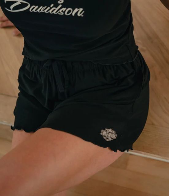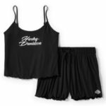 DESCRIZIONE: Lo stile H-D da sogno è qui con set pigiama corto con orlo ondulato. Realizzato in morbido jersey di cotone e spandex per coniugare comfort e elasticità, è provvisto di orlo ondulato per elevare la cifra stilistica. Il top presenta un lusinghiero scollo rotondo con spalline sottimi regolabili, mentre i pantaloncini hanno una comoda coulisse in vita. Il completo è decorato con grafiche per un look Harley-Davidson duraturo ed elegante.