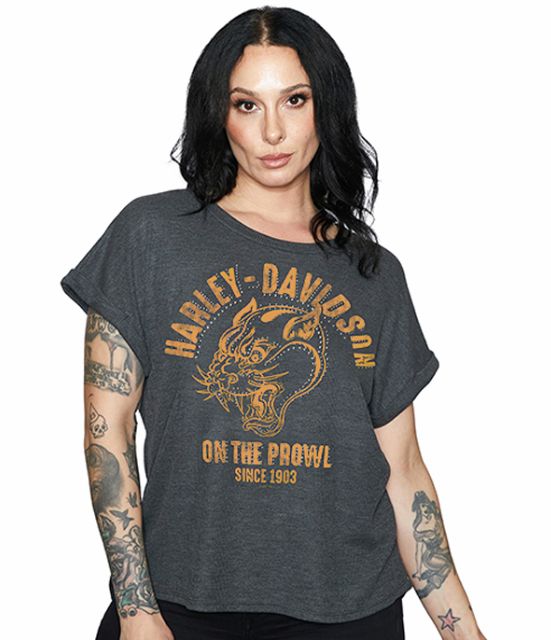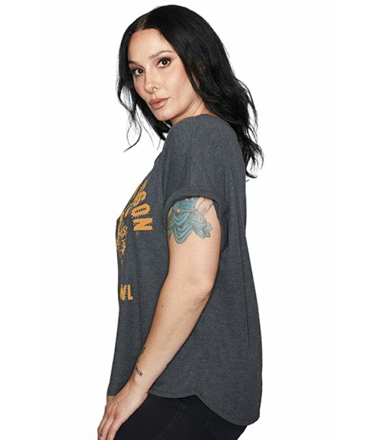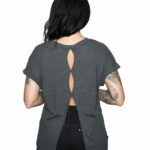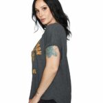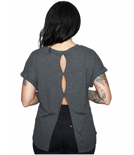 DESCRIZIONE: T-shirt donna vestibilità morbida tessuto effetto nido d'ape con maniche arrotolate, scritta e immagine in contrasto di color giallo oro e con borchie piccole tonde. "On The Prole" la scritta raffigura l'immagine disegnata. Il retro della maglia semi-chiuso  crea quell'effetto "I see I don't see".
