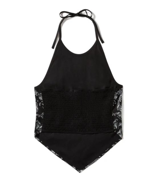 DESCRIZIONE: Quando le temperature sono calde, lo è anche il tuo look con il nostro top a collo alto con bandana Paisley Classic. La sua vestibilità slim è realizzata in leggero twill di viscosa lavato per una maggiore morbidezza. Questo top a collo alto da donna presenta spalline facili da annodare e arricciatura elastica sul retro per un comfort duraturo. È rifinito con una stampa frontale personalizzata all-over per un look HD senza tempo.